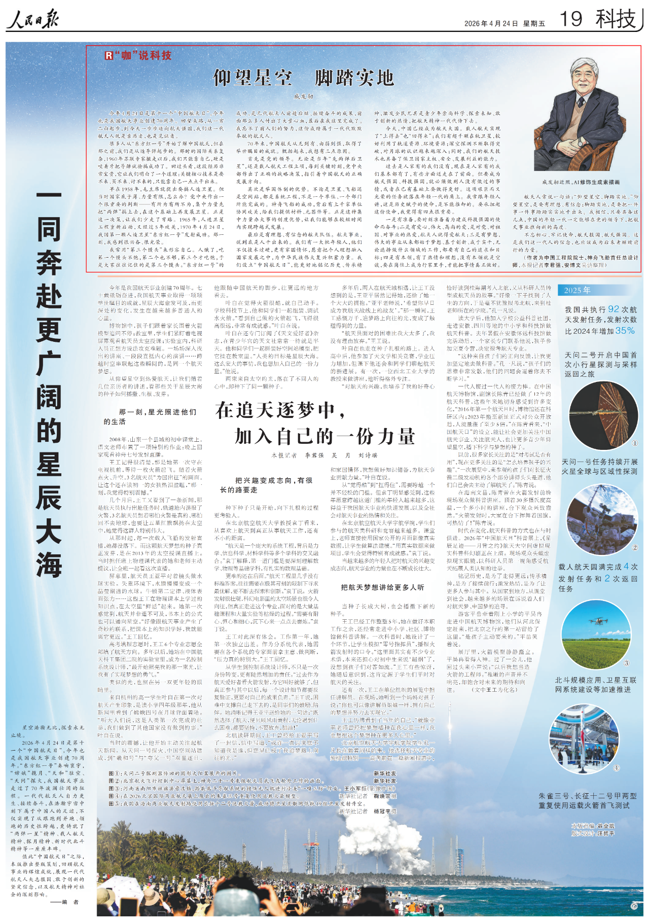 最后是有理想、有信念的航天队伍。航天事业,说到底是人干出来的。我们有一大批年轻人,他们不仅技术过硬,更有家国情怀,愿意把个人理想融入国家发展之中,为中华民族伟大复兴积蓄力量。我们设立“中国航天日”,能更好地铭记历史、传承精神,激发全民尤其是青少年崇尚科学、探索未知、敢于创新的热情,把航天精神一代代传下去。